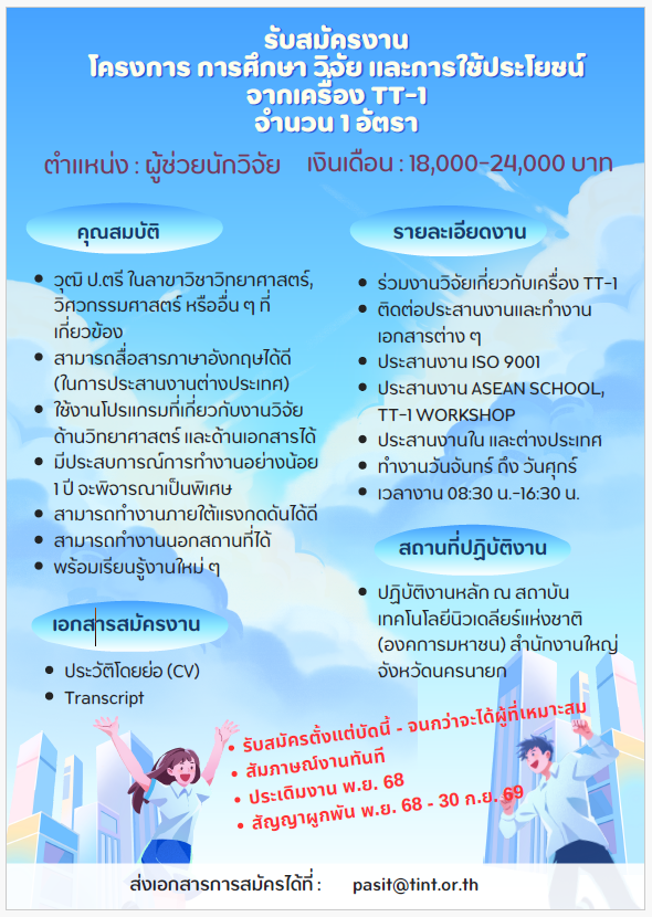 ส่งเอกสารการสมัครได้ที่ : pasit@tint.or.th